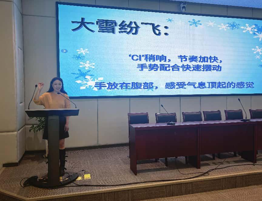 讲堂开篇,主讲人吕相宜老师以“猜旋律识季节”的趣味游戏迅速调动氛围,自然将主题聚焦到这首冬奥主题曲上。音乐深度解析环节,吕老师重点阐释《雪花》“大道至简”的艺术特色:“‘千万雪花,竞相开放’这句歌词看似简洁,却藏着对团结、共融的深情表达。”她结合歌曲童声演唱的特点,解读“干净纯粹的嗓音为何能直击人心”,并带领师生分段学唱——从把握 “竞相开放”中的附点节奏,到感受中英文歌词的旋律变奏,切实体会到《雪花》作为冬奥符号的情感联结价值,也让“更快、更高、更强——更团结”的冬奥精神通过旋律传递到每个人心中。